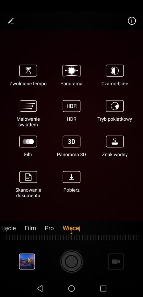 Na pleckach Huawei P20 znajdziemy podwójną kamerę z dwoma matrycami. Pierwsza — kolorowa z rozdzielczością 12 Mpix i światłem f/1.8, druga — monochromatyczna o rozdzielczości 20 Mpix ze światłem f/1.6. Aplikacja, za pomocą której wykonujemy zdjęcia, wygląda schludnie, zaś odnalezienie interesującej nas opcji nie powinno sprawiać nikomu problemu. Faktem jest też, że interfejs wspomnianej apki przypomina ten stosowany w iPhone’ach. Dla mnie jest to akurat zaleta.